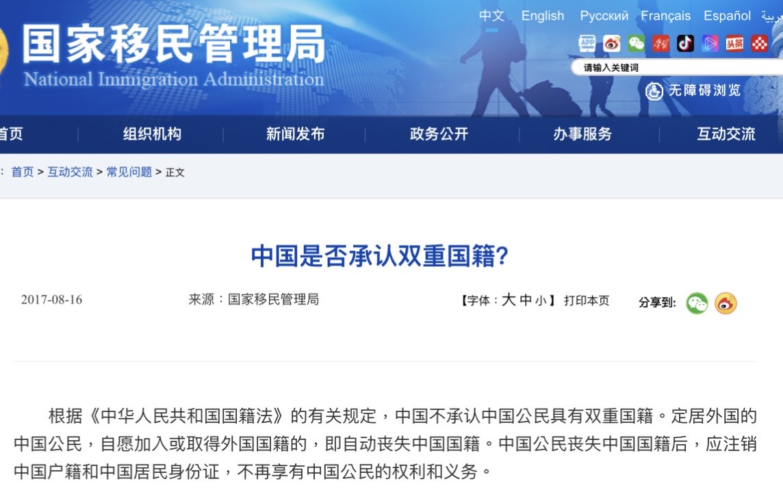 ts012108 : 中國不承認雙重國籍 會不會被一些網民爆破 07/25 13:40