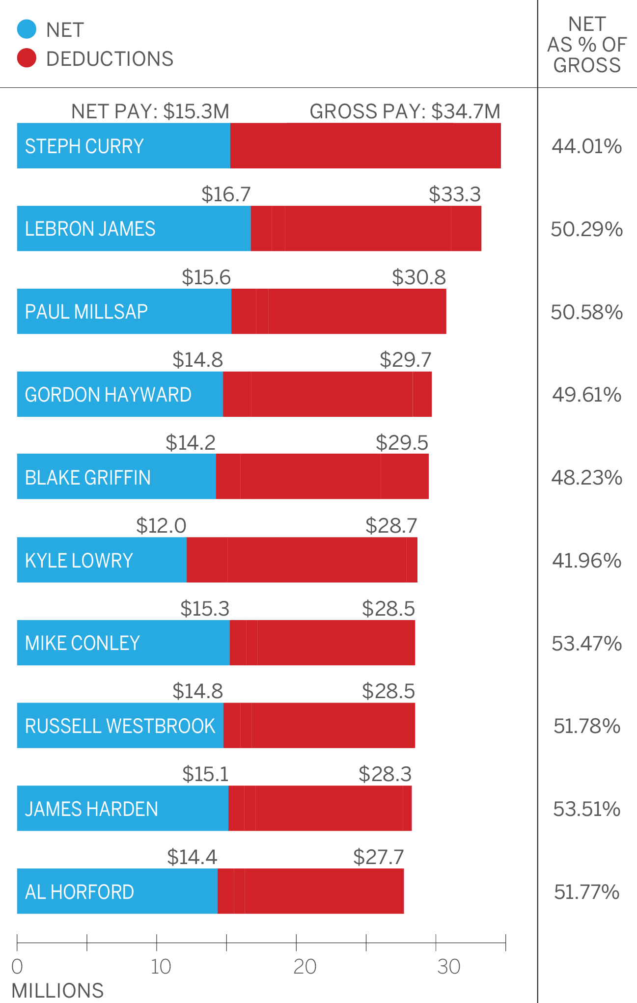https://pse.is/553wt6 Jaylen Brown just signed the richest deal in NBA history (5 years $304 million). Here's how much he will actually earn: $60.8M: Salary - $22.5M: Federal Tax $6M: NBA Escrow $1.8M: Agent Fee $1.4M: FICA/Medicare $1.8M: Jock Tax $2.7M: Massachusetts Tax = $24.5M: Net Income Jaylen Brown剛剛簽下了 NBA 歷史上最貴的合約(5 年 3.04 億美元) 這是他實際賺多少錢: 6080萬:平均每年薪水 - 2250萬:聯邦稅 600萬:NBA第三方託管費 180萬:經紀人費用 140萬:聯邦社會保險醫療保健稅/醫療保險費 180萬:傑出運動員稅 270萬:麻薩諸塞州州稅 = 2450萬:淨收入 ------------ 稅太重了吧 之前書豪說合約到手剩1/2 布朗這張直接剩快1/3 -- ※ 發信站: 批踢踢實業坊(web-ptt.tw), 來自: 1.165.12.29 (臺灣) ※ 文章網址: https://web-ptt.tw/NBA/M.1690509352.A.0FF