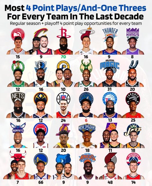 https://twitter.com/automaticnba/status/1685042487201587200 This one's pretty niche, but it's the player with the most 4 point plays for eve ry team in the last decade. A certain few definitely stand out. 這個數據相當冷門,這是過去10年每支球隊裡獲得最多次3+1的球員,其中絕對有幾個明顯 突出的。 https://i.imgur.com/4MUGPAw.jpg