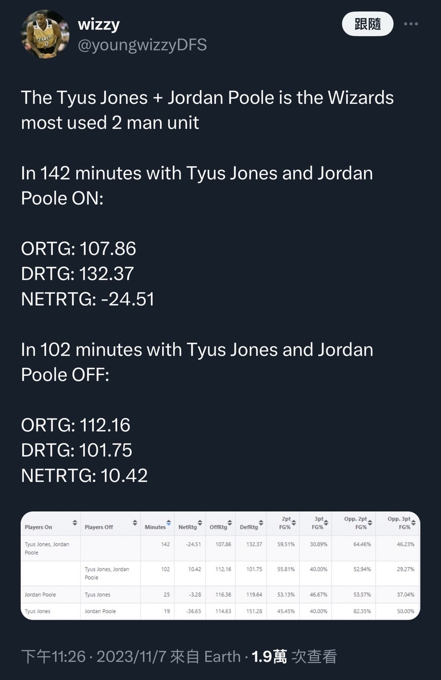※ 引述《pneumo》之銘言 : 來源:StatMuse : 網址:https://www.statmuse.com/nba/ask?q=best+total+plus+minus+2023-2024 : https://www.statmuse.com/nba/ask?q=worst+total+plus+minus+2023-2024 : ◎最佳10名 :  ̄ ̄ ̄ ̄ : NAME 球隊 場次 +/- 上場時間 : Nikola Jokic 金塊 8 +102 272 : Jayson Tatum 青賽 6 +97 218 : K.Caldwell-Pope 金塊 8 +95 260 : Aaron Gordon 金塊 8 +87 246 : Paul George 快艇 6 +80 201 : Derrick White 青賽 4 +72 119 : Michael Porter Jr.金塊 8 +71 221 : Tyrese Maxey 76人 6 +69 223 : Kawhi Leonard 快艇 6 +68 199 : Anthony Edwards 灰狼 6 +68 215 : ◎最糟10名 :  ̄ ̄ ̄ ̄ : NAME 球隊 場次 +/- 上場時間 : Tyus Jones 巫師 6 -84 161 : Jeremy Sochan 馬刺 7 -80 184 : Walker Kessler 爵士 8 -78 192 : Kyle Kuzma 巫師 6 -75 173 : Jordan Poole 巫師 6 -75 168 : Ziaire Williams 灰熊 7 -75 201 : DeMar DeRozan 公牛 8 -74 271 : Malik Beasley 公鹿 6 -67 156 : Davion Mitchell 國王 6 -67 124 : John Collins 爵士 8 -59 245 : ---- : 去年也是差不多這時候統計了一下正負值。 : 金塊/巫師洗榜。 附上目前三人組合正負最佳的 (至少一百分鐘) https://x.com/esidery/status/1722357323505504290?s=46&t=r8cO59-Jxq4bYLuhHbUn0g The best 3-man lineup combinations so far this season (minimum 100 minutes): 1. Kawhi Leonard, Paul George, Russell Westbrook = +27.4 NetRtg 2. Fred VanVleet, Dillon Brooks, Alperen Sengun = +24.3 NetRtg 3. Pascal Siakam, Scottie Barnes, OG Anunoby = +23.3 NetRtg 4. Jayson Tatum, Jaylen Brown, Kristaps Porzingis = +22.5 NetRtg 1. 可愛,PG ,西河(這幾天應該下降了…) 2. FVV, 狄龍, 神棍 3. Siakam, Barnes, OG 4. Tatum, Brown, Porzingas ---- Sent from BePTT on my iPhone 14 Plus -- ※ 發信站: 批踢踢實業坊(web-ptt.tw), 來自: 114.137.52.126 (臺灣) ※ 文章網址: https://web-ptt.tw/NBA/M.1699512228.A.AA7