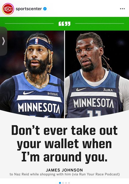 「我和Jaylen Nowell一起James Johnson,不對應該 是說他帶我們去逛街,我也不是真的要花大錢的買,就只想花1000塊而已。 那時候我拿了一雙Dior的鞋子要去結帳他直接制止我跟我說只要他在場我就不用自己付錢還叫我去多挑一些他會處理,我又只好拿了一些東西總共幾千塊,他還嫌我買太少,反正後來我們三個人花了3、4萬塊,很誇張。 「我一開始還不敢相信,我想說我認識你但也沒有這麼熟,你知道我是一個重視忠誠可靠的人,所以每次遇到他我對他都是滿滿的尊敬和愛」 心得: 如果我有一個糖爹的話我對他也是滿滿的愛跟尊敬。 JJ在灰狼當時年薪1500萬,但現在NR年薪也才1300萬。當初灰狼簽NR真的便宜 ----- Sent from JPTT on my iPhone -- ※ 發信站: 批踢踢實業坊(web-ptt.tw), 來自: 111.241.127.225 (臺灣) ※ 文章網址: https://web-ptt.tw/NBA/M.1729090194.A.150