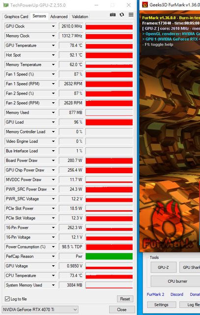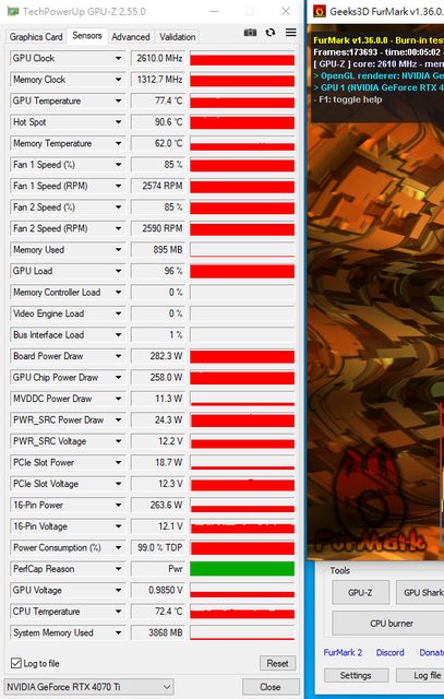 後面會買一條PCIe延長線,在裸測狀態下重新測過一遍魔龍4090及白龍4070Ti