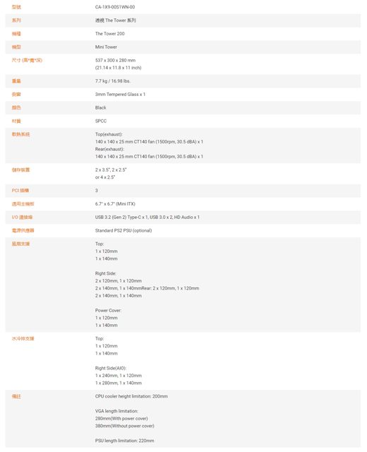 其中一側為Tower 200的尺寸及支援的零組件規格,為了不傷害各位的眼睛另外將官網規