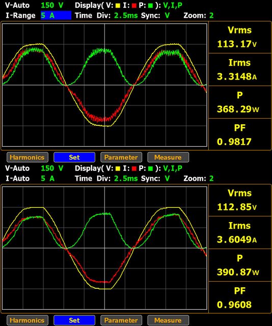 線時交流電壓(黃色)/電流(紅色)/功率(綠色)波形,使用延長線時波形較為平滑,波形上