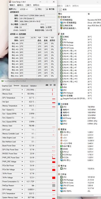 ▼CPU+GPU高負載30分鐘後Core Temp、GPU-Z感測器、AIDA64感測器頁面