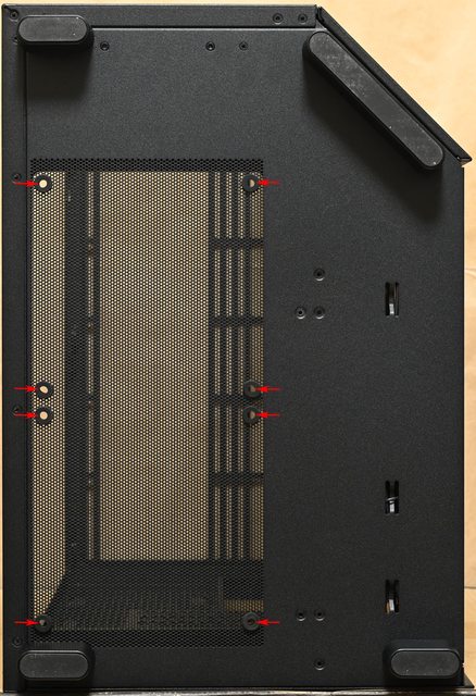 ○底部/前方右側斜面/頂部/後方提供最多9個風扇安裝空間,前方右側斜面預裝3個機殼