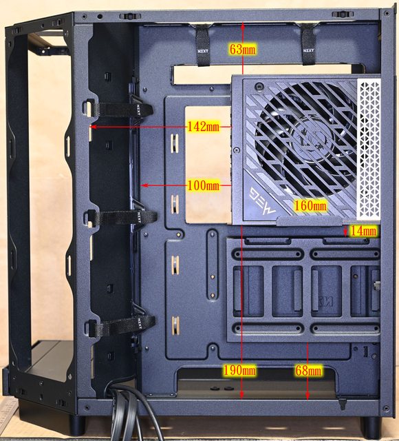 ▼安裝160mm長度電源時,電源上方邊緣距離右艙頂部63mm,電源左側邊緣距離右艙前端