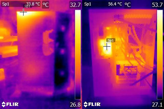 ▼CPU+GPU高負載30分鐘後的前方(左)、後方(右)的紅外線熱影像圖