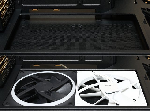 ▼機殼左艙頂部長條形固定孔可裝3個120mm或2個140mm風扇,水冷排可裝到360mm。右艙