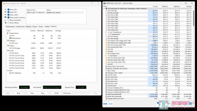 CPU 單獨功耗都在 350W 內,CPU 溫度約在 81 度附近,整機功耗在 550W。