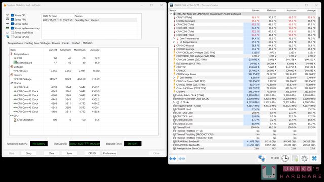 CPU 單獨功耗都在 350W 內,CPU 溫度約在 95 度附近,整機功耗在 550W。由於頻率較高