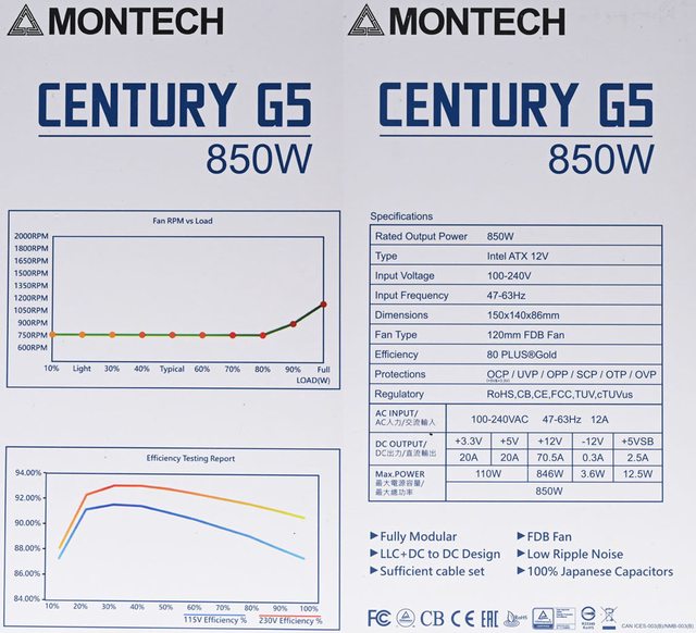 ▼外盒左側面有MONTECH商標、CENTURY G5名稱、850W輸出功率、風扇轉速VS輸出功率圖