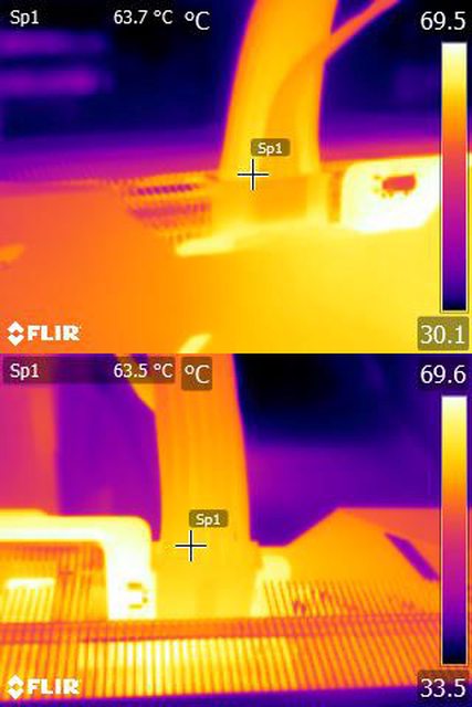 ▼單條PCIE 6+2P連續輸出21A(252W)10分鐘後的電源端模組化接頭紅外線熱影像圖(附註
