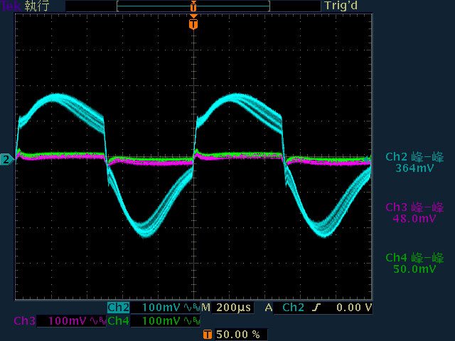 以下波形圖,CH2藍色波形為12V電壓波形,CH3紫色波形為5V電壓波形,CH4綠色波形為