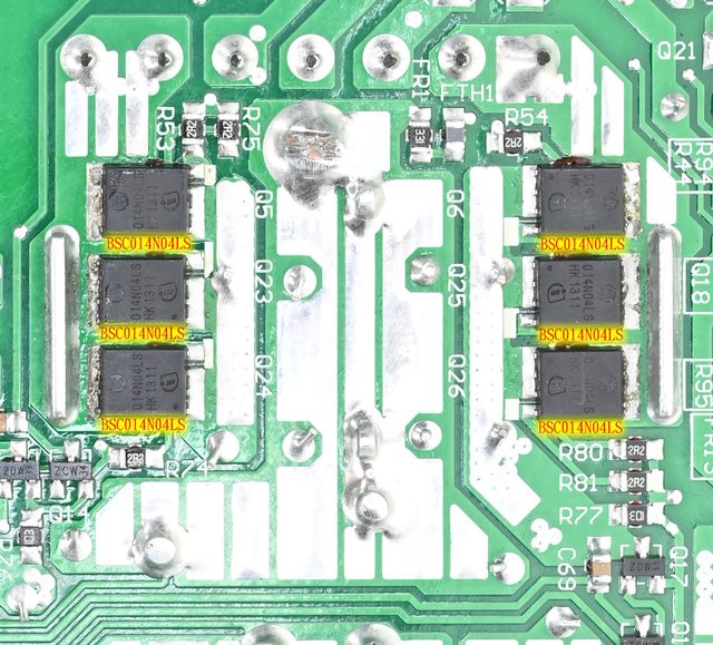 ▼主電路板背面焊點做工良好,大電流路徑有敷錫處理