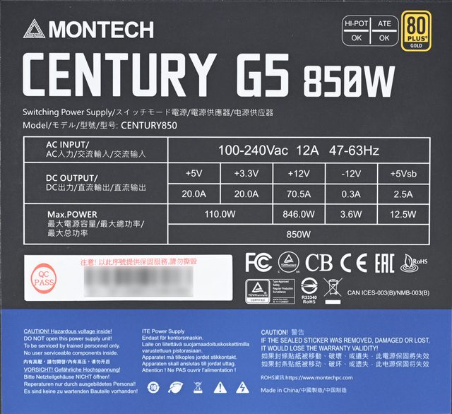 ▼本體背面標籤有MONTECH商標、80PLUS金牌認證、CENTURY G5名稱、850W功率、型號、