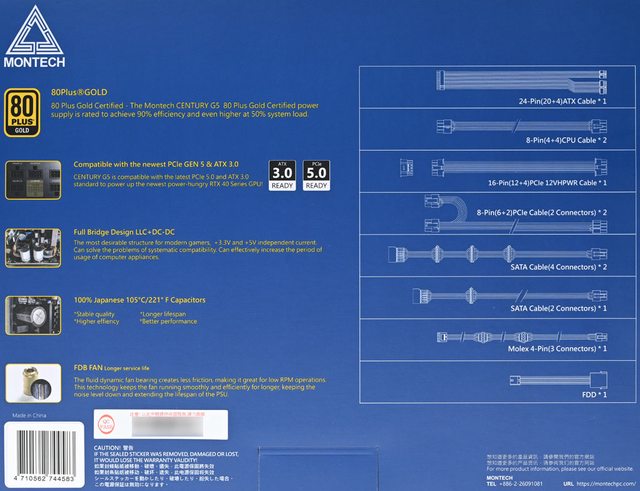 ▼外盒背面有MONTECH商標、特色說明、線組樣式/接頭配置/數量表、條碼、注意事項、