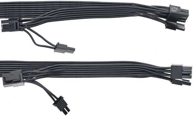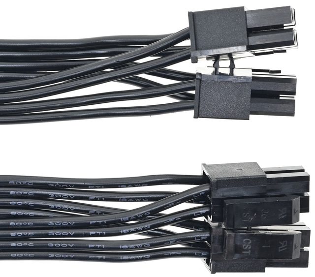▼2條顯示卡電源黑色帶狀模組化線路,提供4個PCIE 6+2P接頭,至第一個接頭18AWG線路