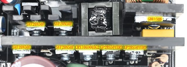 ▼GBU1506橋式整流器裝在右上方的散熱片上,APFC的2個Greatpower GP28S50YERD