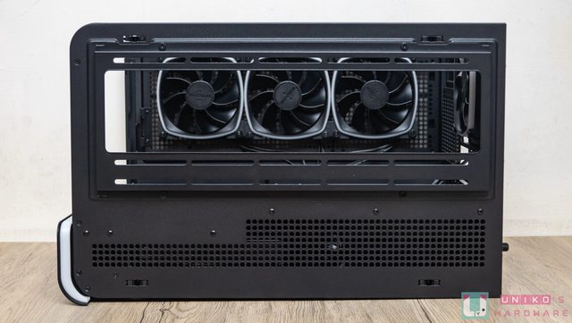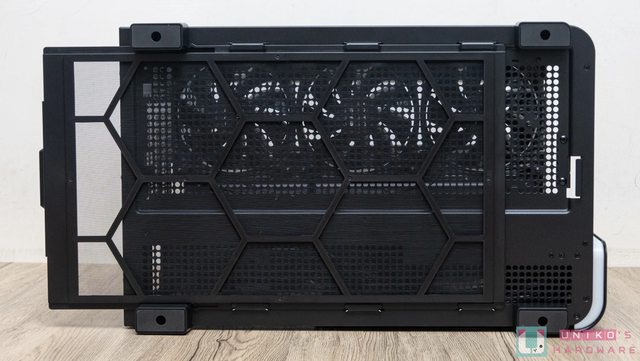 蓋可說是全透氣設計。拆裝無需使用工具,移除後可看見支援 120 mm x 3 / 140 mm x 2