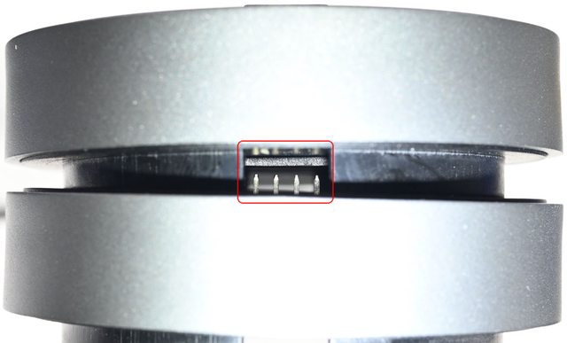 ▼基座頂部有4個圓弧溝槽及2個塑膠壓扣插入孔,方形保護蓋取下後可看到1個7pin插針