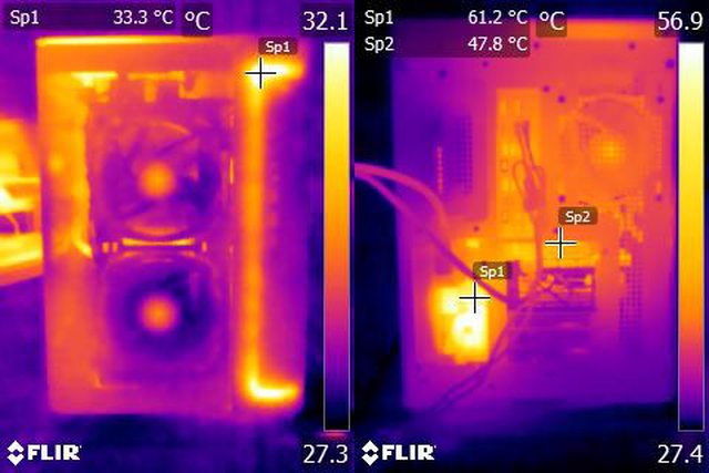 ▼正面安裝強化玻璃面板,由右側前方及底部進風時,CPU+GPU高負載30分鐘後的正面(左