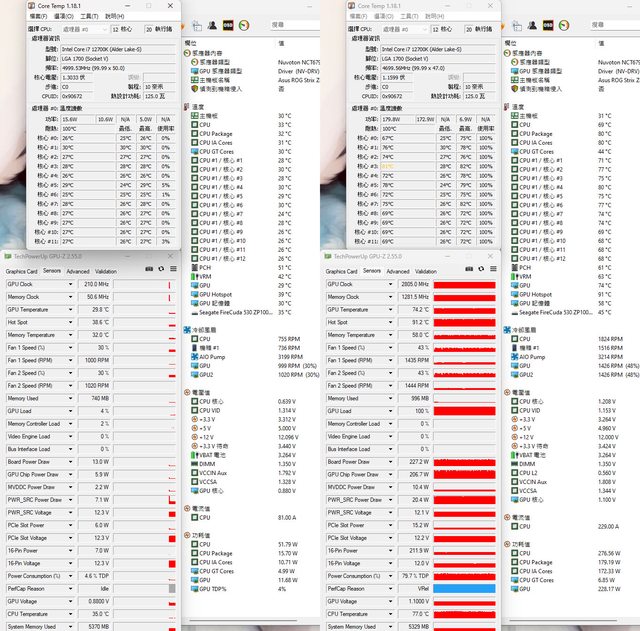 30分鐘後(圖右)Core Temp、GPU-Z感測器、AIDA64感測器頁面