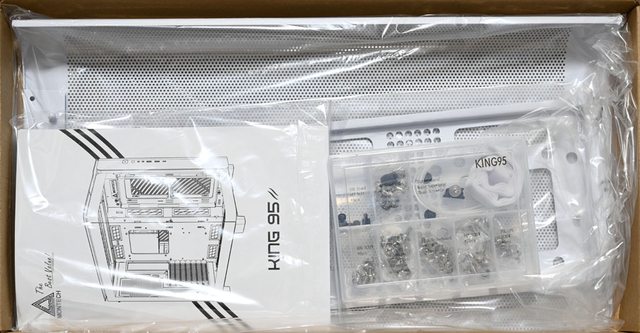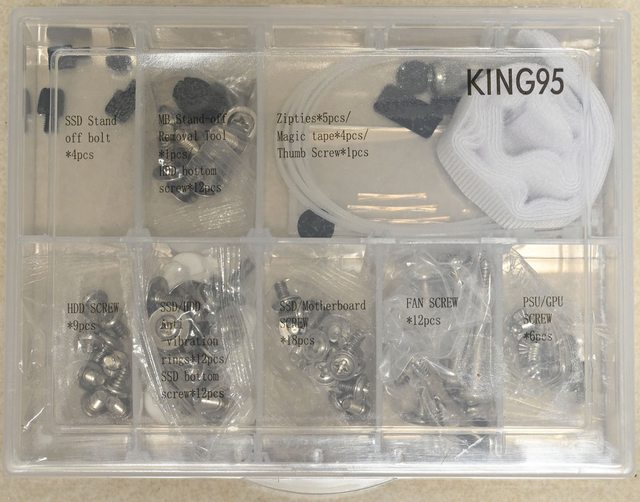 ▼配件盒正面有商標、顏色標示、KING 95字樣、正面網孔板安裝圖、左艙底部3.5吋/2.5