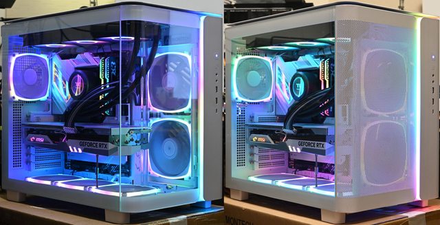 ▼正面安裝強化玻璃面板,由右側前方及底部進風時,CPU+GPU高負載前(圖左)及高負載
