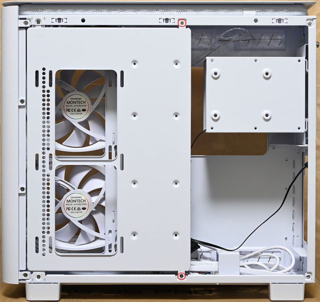 ▼左艙頂部固定架配置長條形固定孔,可安裝3個120mm或2個140mm風扇,水冷排可裝到