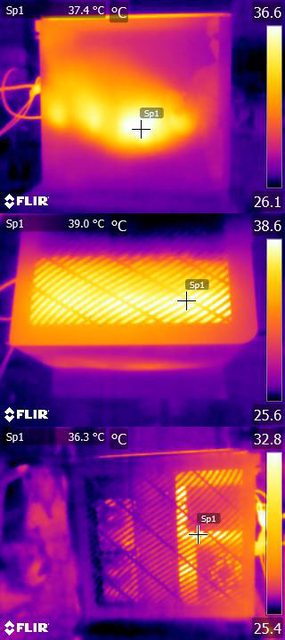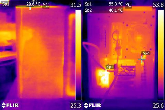 ▼正面安裝網孔板,由正面、右側前方及底部進風時,CPU+GPU高負載30分鐘後的正面(左