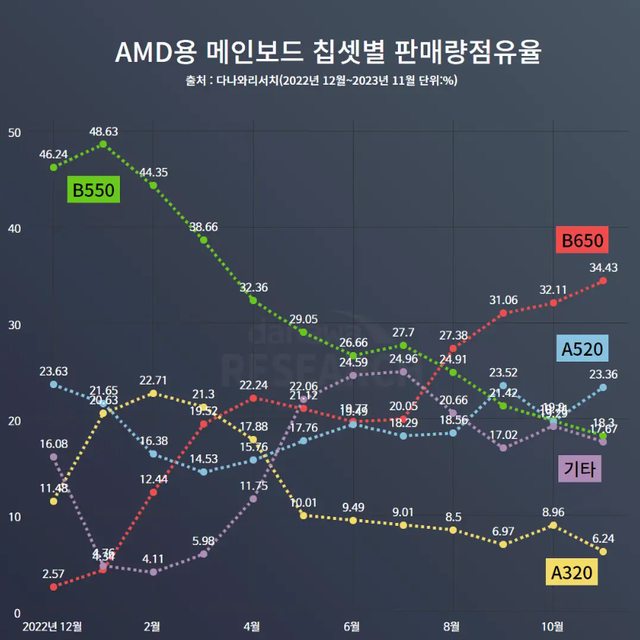 韓國目前的 AMD B650 主機板已經佔據了 34.43% 的市場份額