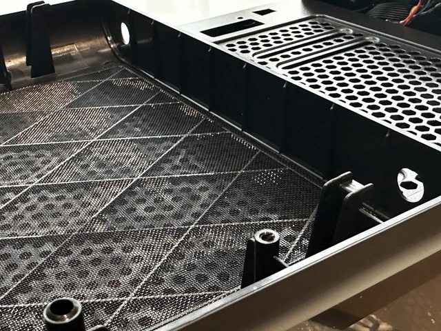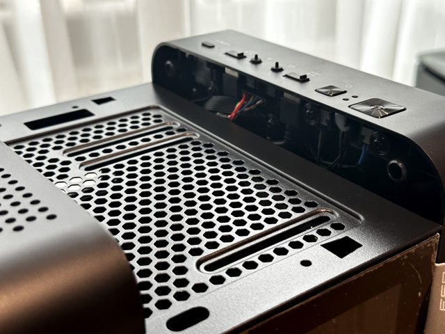 CUT593P特色之一是圓潤的四角,前面板預設為塑膠材質的六角形大孔洞通風面板,整體