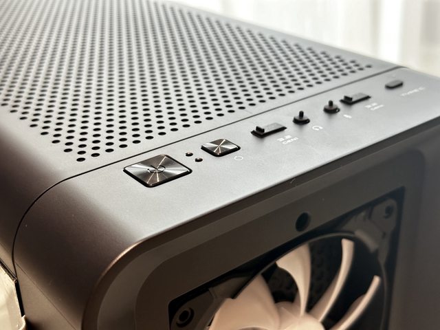 機殼IO設於前上方,幾乎已是標準配置的2個USB A孔、1個TYPE-C孔及3.5mm接口x2,且貼