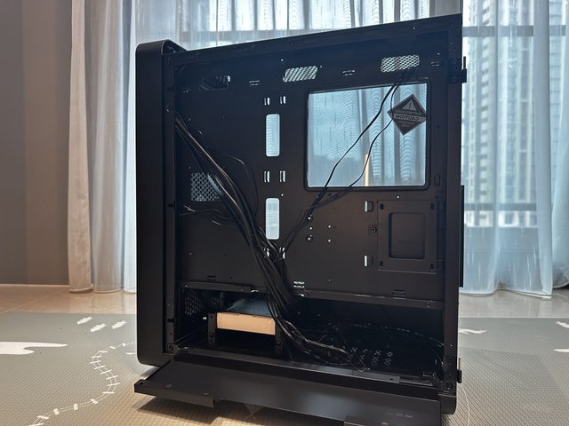 另一側也為玻璃側版,採用門片式開啟方式,P版預裝了電源延長線且已固定於背板的整
