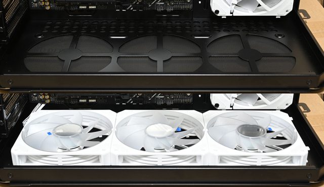 ▼安裝3個JONSBO ZG-120魔組扇(右側前方)及3個JONSBO ZG-120R反轉魔組扇(底部)的左