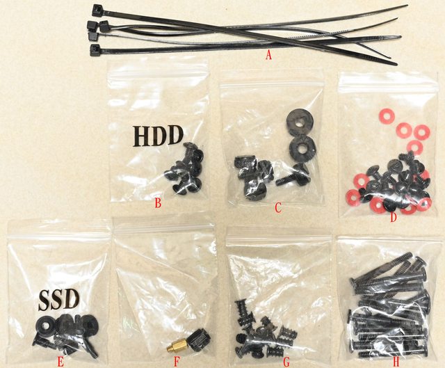 板固定螺絲/墊圈(D)、2.5吋裝置專用螺絲/墊圈(E)、主機板銅柱/套筒工具(F)、風扇固