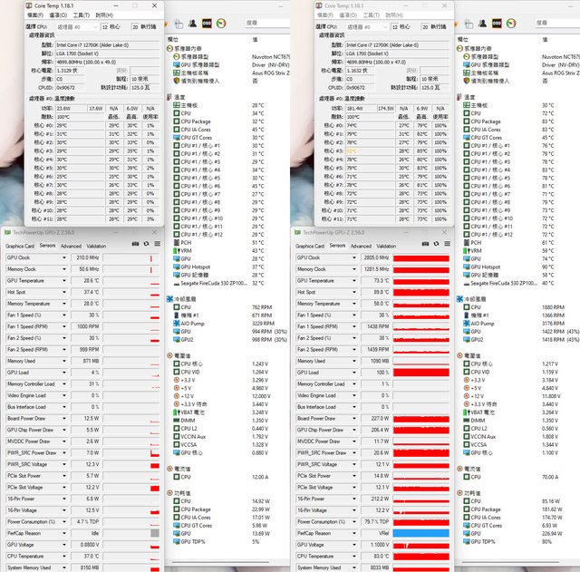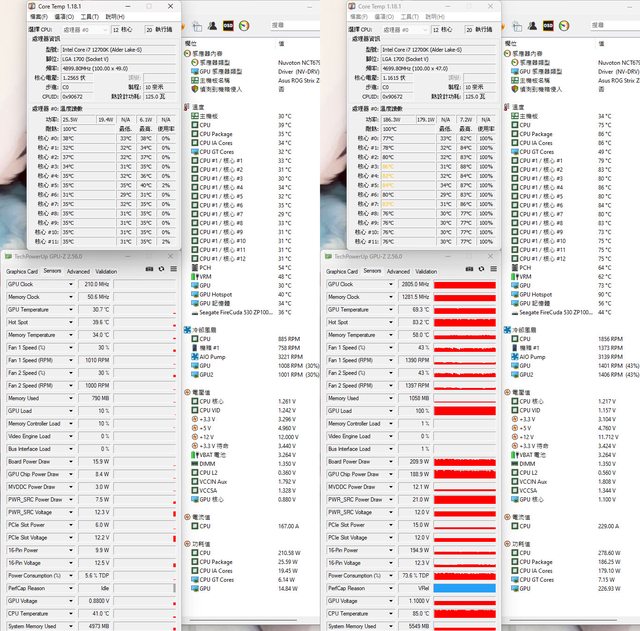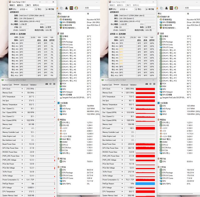 ▼風扇配置一:CPU+GPU高負載前(左)及高負載30分鐘後(右)的Core Temp、GPU-Z感測器