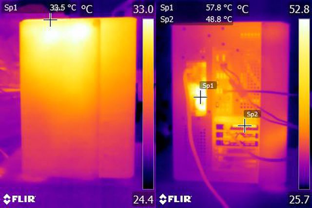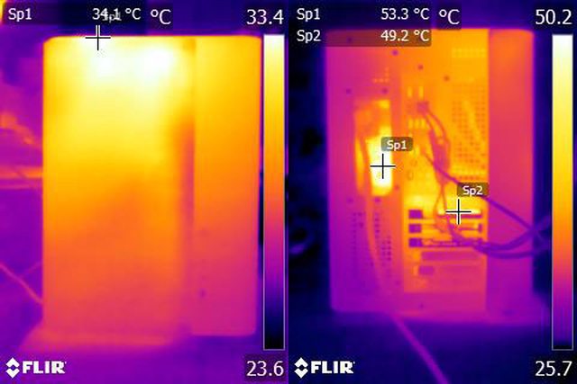 ▼風扇配置二:CPU+GPU高負載30分鐘後的正面(左)及後方(右)紅外線熱影像圖