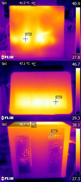 ▼風扇配置二:CPU+GPU高負載30分鐘後的左側(上)、頂部(中)及右側(下)紅外線熱影像