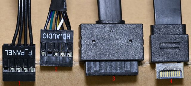 ▼機殼連接線組,1為電源開關/電源指示燈的一體式接頭,2為耳機/麥克風插座的接頭,