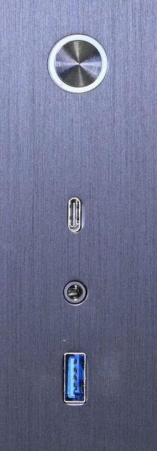 USB3.2 Type-C、4極耳機麥克風3.5mm插座、USB3.2 Type-A。未配置重置按鈕及硬碟指示