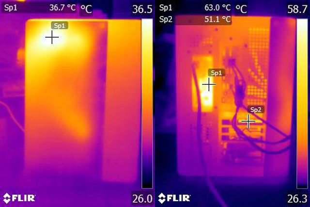 ▼風扇配置三:CPU+GPU高負載30分鐘後的正面(左)及後方(右)紅外線熱影像圖