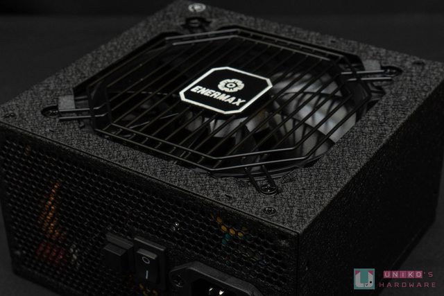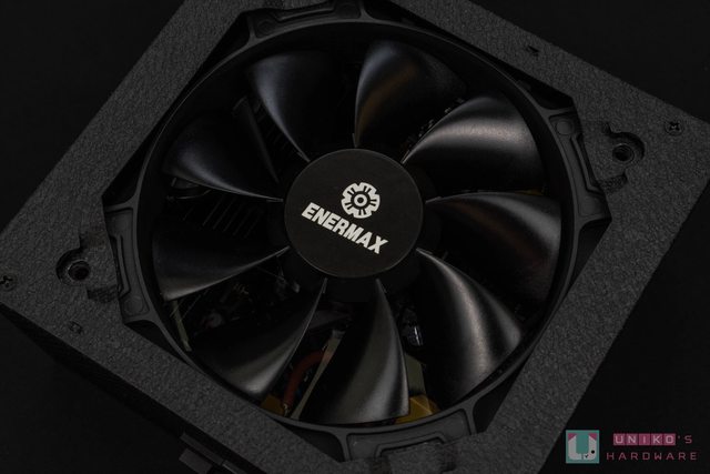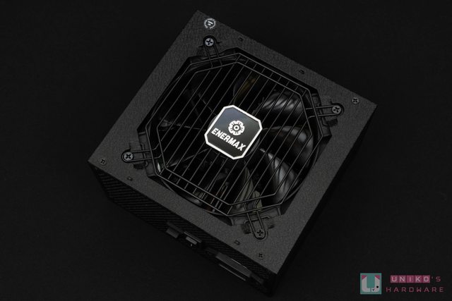 的 ENERMAX Logo 貼紙,四邊用十字螺絲固定。仔細看電供的話還會注意到周邊有獨特的磨