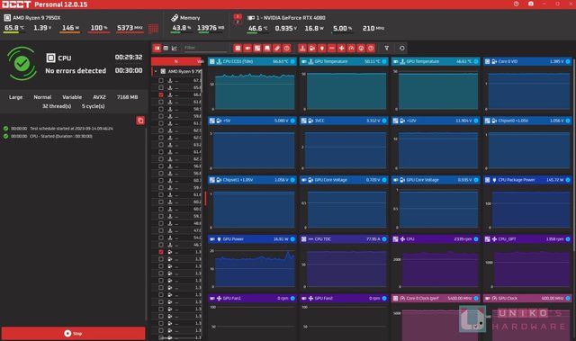 我們也簡單藉由 OCCT 軟體測試 ENERMAX D.F.X REVOLUTION 1200W 電供的穩定性,搭配的