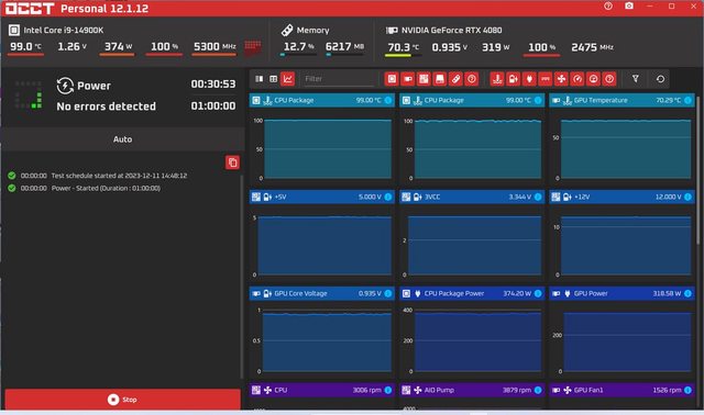 使用 OCCT 12.1.12 執行電源供應器壓力測試,測試時間為 30 分種,CPU 功率 374W,