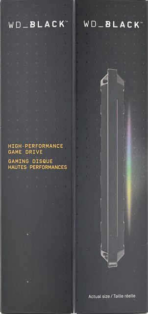 ▼外盒左/右側面有WD_BLACK字樣、HIGH-PERFORMANCE GAME DRIVE字樣、產品實際大小側
