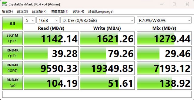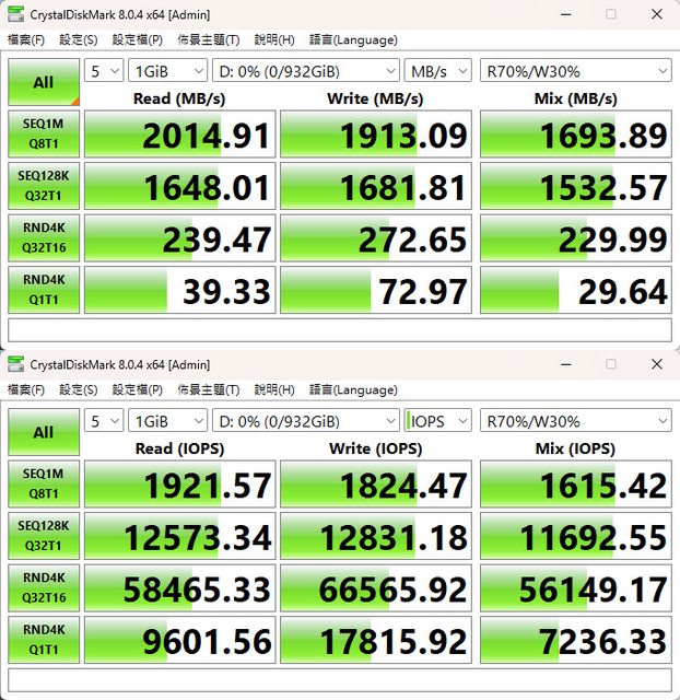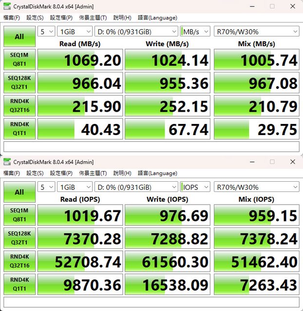 ▼CrystalDiskMark預設(NVMe)+Mix(R70%/W30%)測試