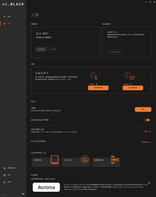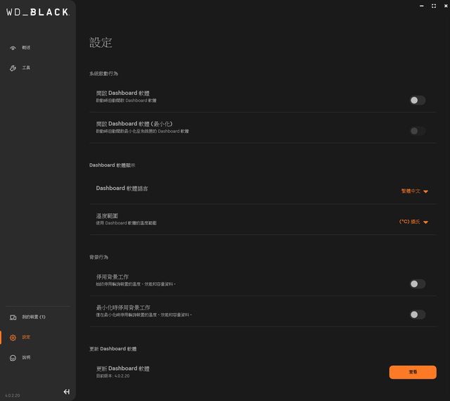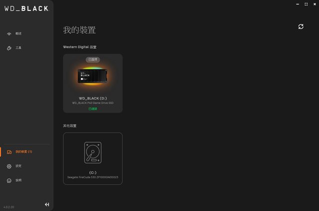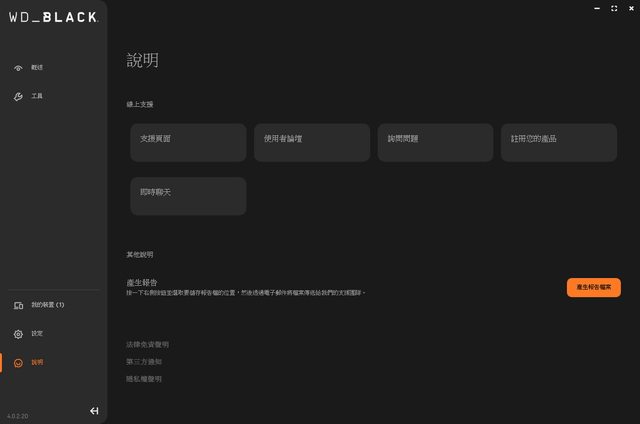 ,最上面有WD_BLACK字樣,最下面有版本及隱藏子頁面選單按鈕。概述子頁面顯示裝置外