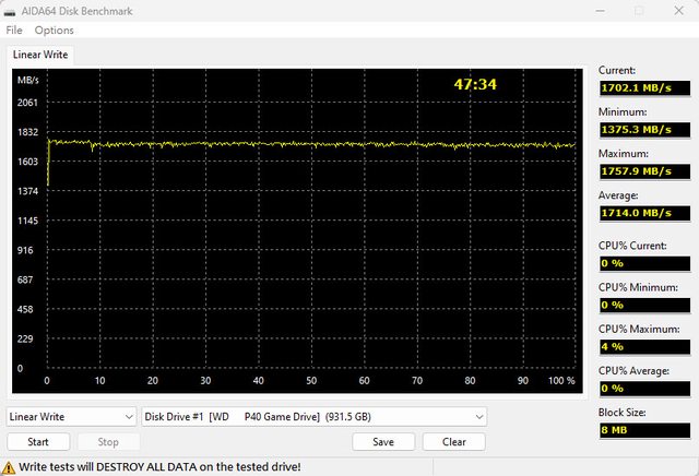 ▼AIDA64 Disk Benchmark寫入測試,最高速度1757.9MB/s,最低速度1375.3MB/s
